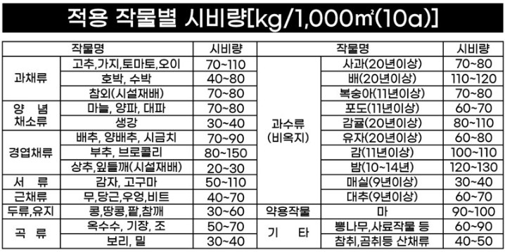 적용 작물별 시비량[kg/1,000㎡(10a)]